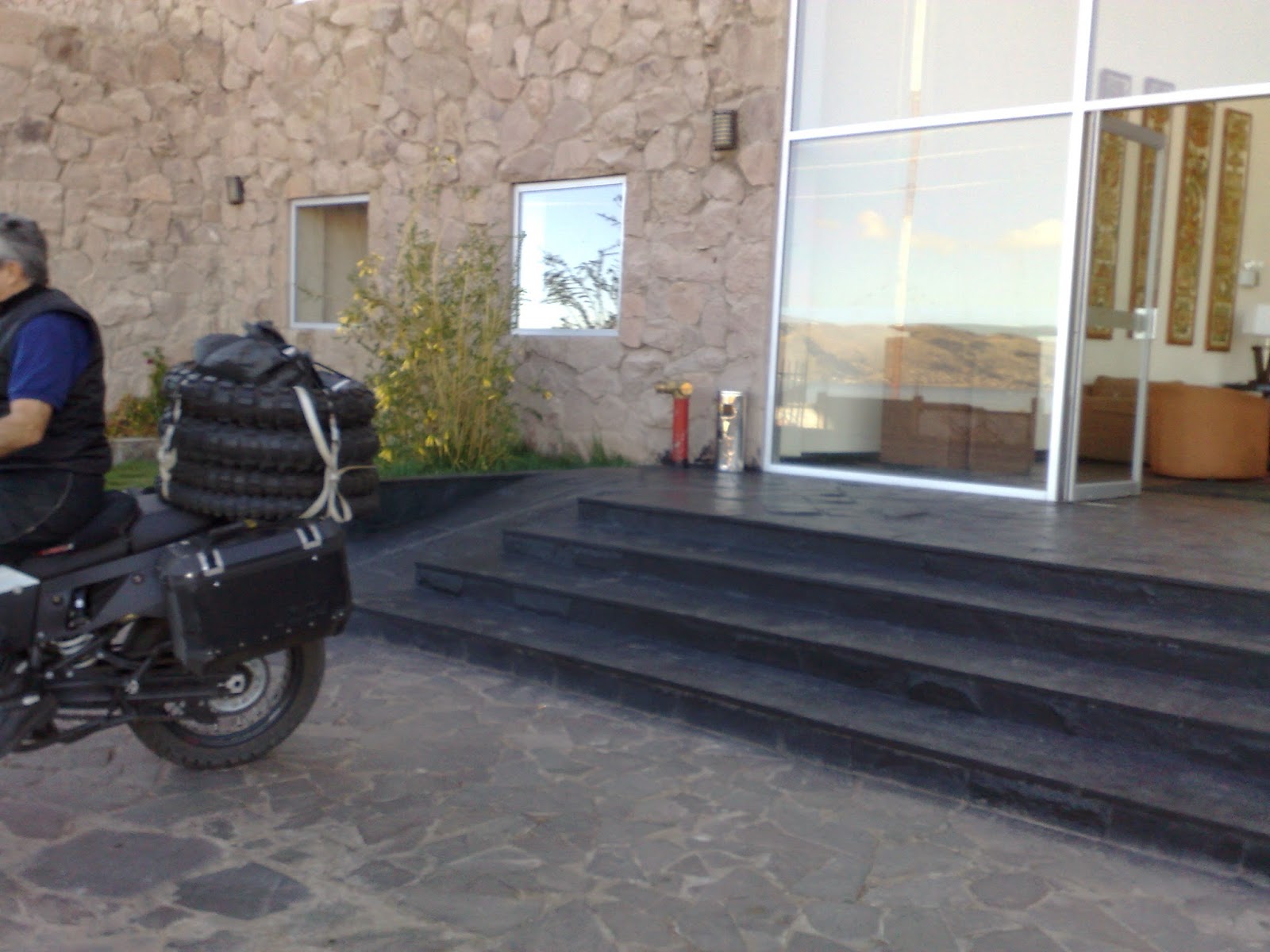 O atraso foi devido à recuperação do Julio que sentiu uma fortíssima fisgada nas costas ao evitar que sua moto fosse ao chão na segunda feira na troca dos pneus. Na tentativa de usar o apoio lateral pra descolar o pneu sem câmara o mecânico quase derrubou a moto e ao segurá-la o Julio sentiu uma forte fisgada nas costas. Do lado do nosso hotel havia uma clínica com um bom serviço de fisioterapia ao que ele se submeteu intensamente e melhorou muito em dois dias de tratamento.