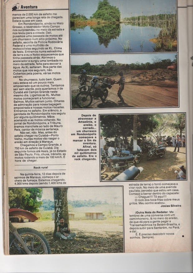 A primeira dessa serie é clássica! A viagem do Josias Silveira (pra que não conhece, Josias é o proprietário da Revista Duas Rodas) de Manaus a São Paulo, no lançamento da XL 250R atravessando a transamazonica! Alem da reportagem – fantástica – ele nos presenteia com uma avaliação da moto depois de percorrer os mais de 4.000 km… Aventura à moda antiga… Teste à moda antiga!