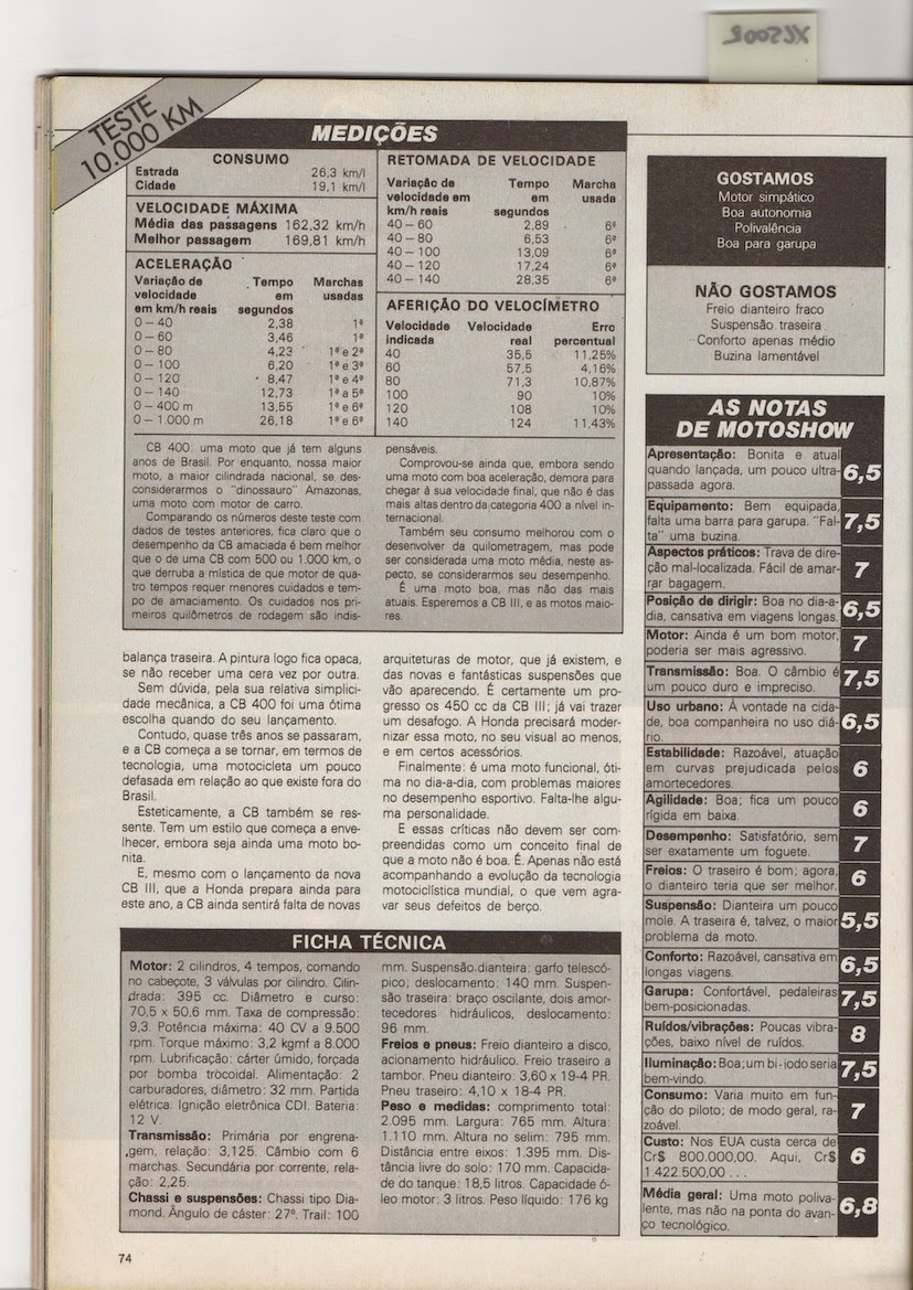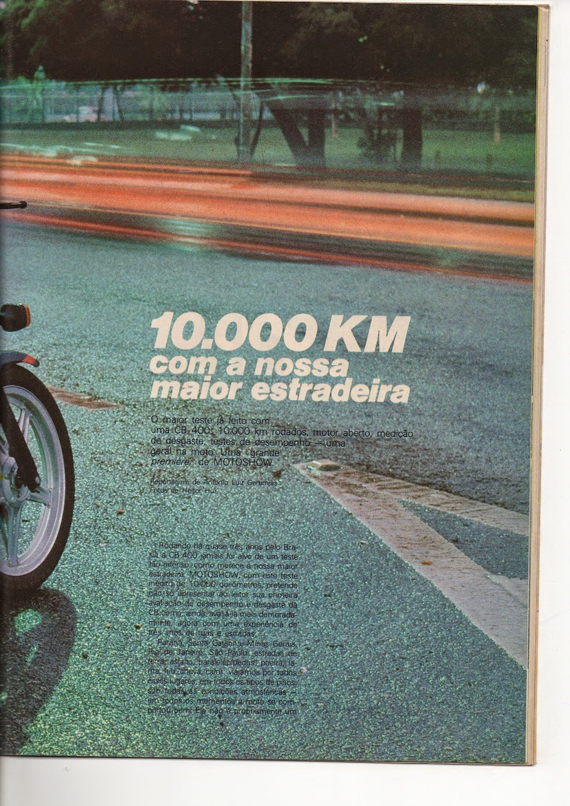Motoshow, inovando, provocando a concorrência em suas primeiras edições trás um interessante, completo, caprichado teste de 10.000km com a CB400 (I) com todas as medições, opiniões de pilotos, chuva, asfalto, terra, paralelepípedo, num roteiro alucinante pelos estados do sul e sudeste do Brasil.