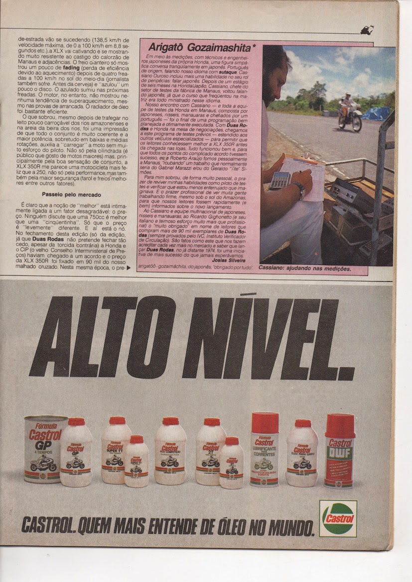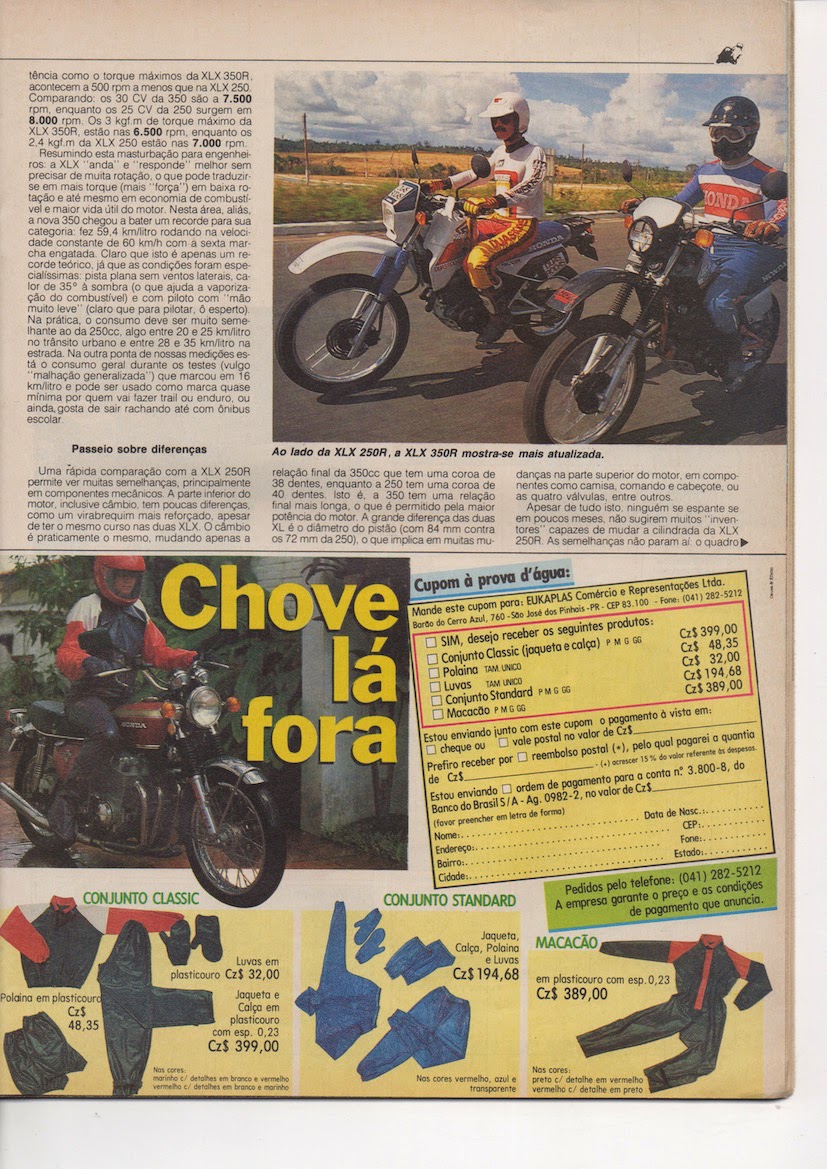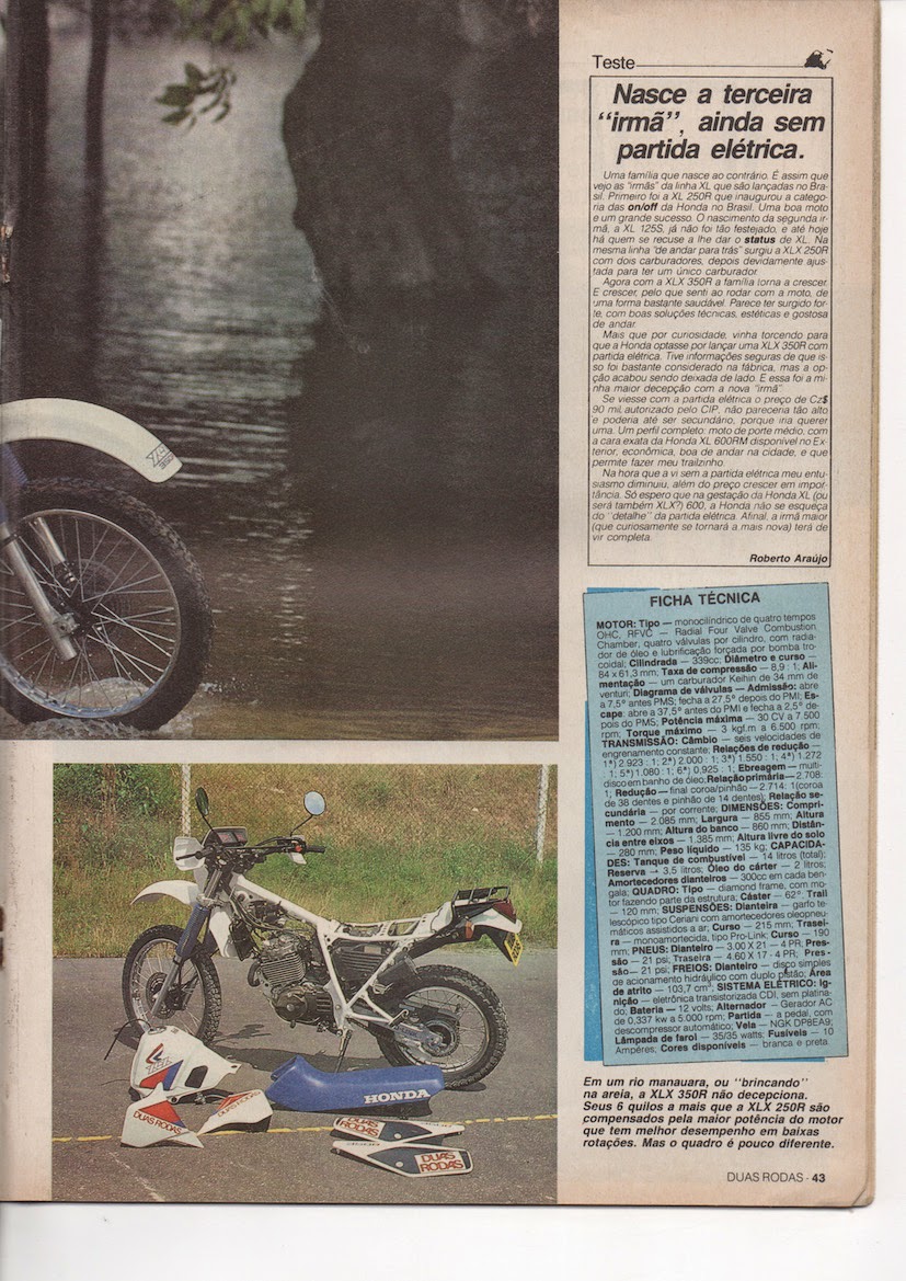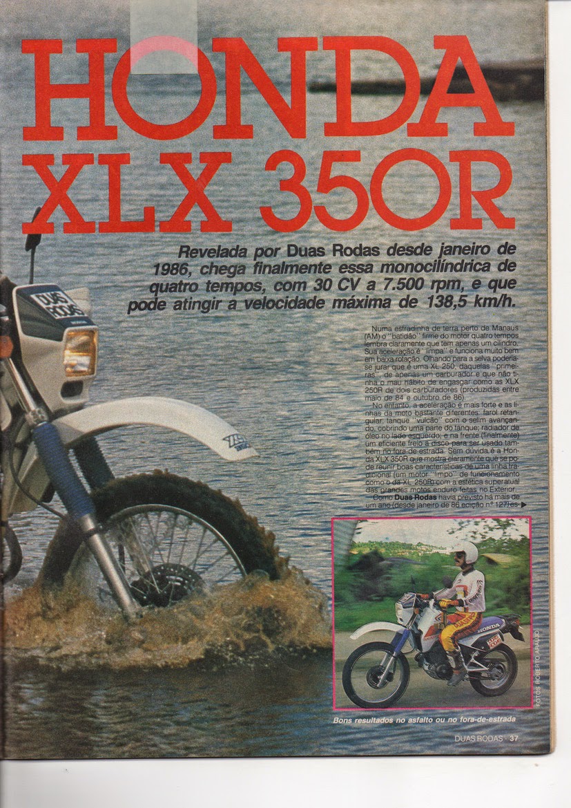 XLX350R em seu lançamento, inicio de 1987, testada em condições muito especiais:  -Realizado pelo Josias Silveira (fundador e diretor da Revista Duas Rodas), e direto no “ninho”das XLX nacionais – em Manaus, AM.