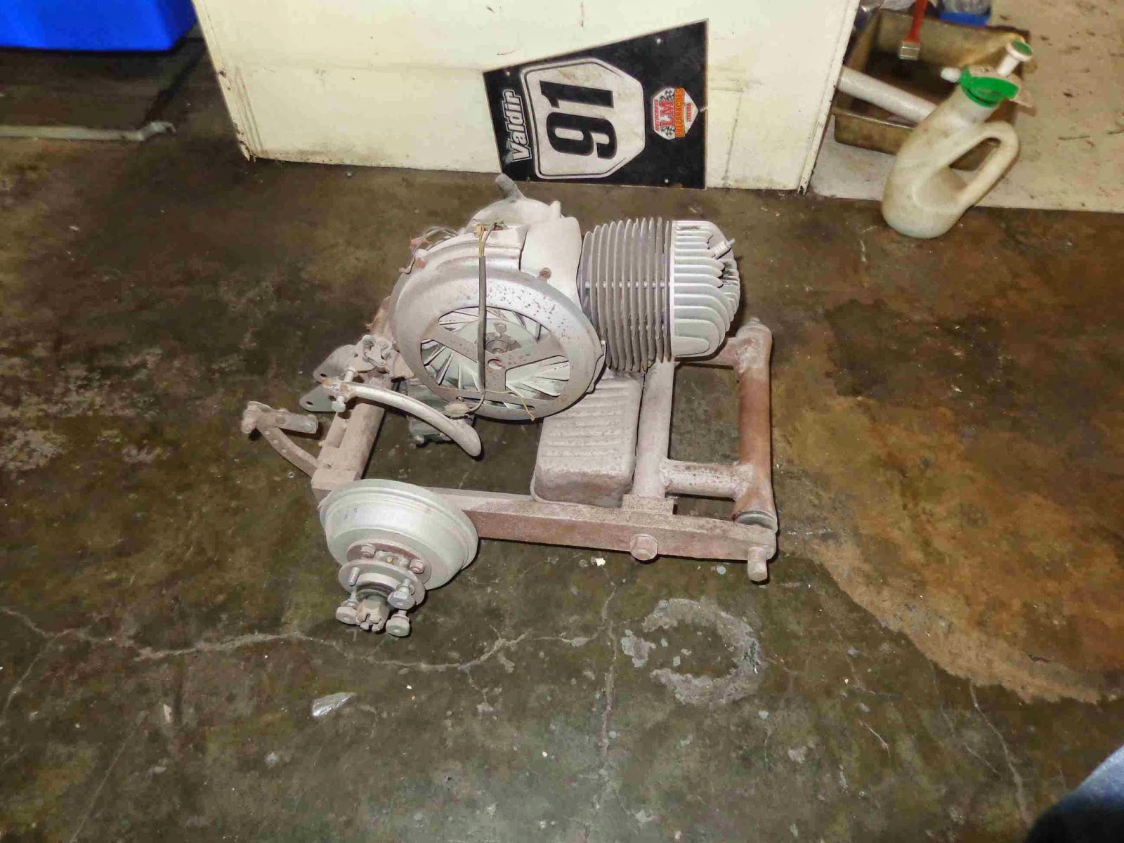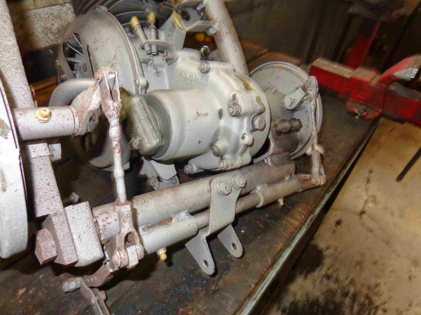 90% de uma vespa, visualmente falando, é sua “lataria” ou o chassi… portanto num trabalho de restauração a parte mais impactante é a funilaria. Neste primeiro momento, ela foi toda desmontada, sua lata reparada (amassados, ferrugens) e lixada ou jateada. Nesta etapa de desmontagem é que aparecem as grandes surpresas da restauração, são conhecidas as peças faltantes, aparecem as gambiarras feitas nesses mais de 50 anos de manutenção (ou falta dela). Tudo deve ser corrigido e levado de volta ao original.