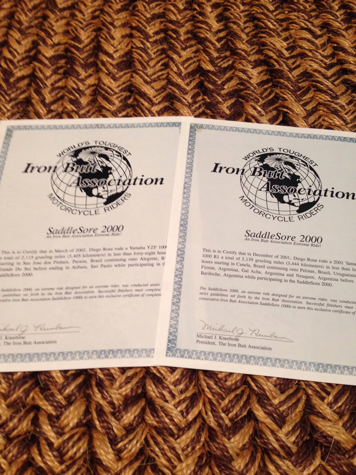 | Meus certificados IronButt: 8 SaddleSore 1000 – 2 SaddleSore 2000 – 2 BunBurner 1500 – 1 BunBurner Gold 1500 – 1 Latin America 30cc Gold (costa a costa) |