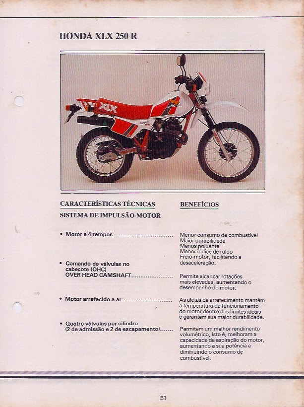 Dizem que o melhor sempre fica pro final, não é mesmo? Pois é, pro final desse catalogo que encontramos perdido, ficaram a XLX250R – a de 2 carburadores, e antes de terminar vamos ter ainda a que era recém lançada, a XL125S… nos próximos dias ela aparecerá… boa diversão a você, caro leitor com a XLX250R que, criticadas por muitos e amada por outros justamente por possuir carburador de corpo duplo. Em minha opinião, injustiçada, pois ela tinha um desempenho excepcional (quase acompanhando a XLX350R) e bastava uma boa regulagem pra garantir a diversão… como também dizem que tudo que é bom dura pouco, a festa do desempenho acabou rapidamente e as demais XLX que vieram nos anos seguintes, eram mais modestas em termos de desempenho…
