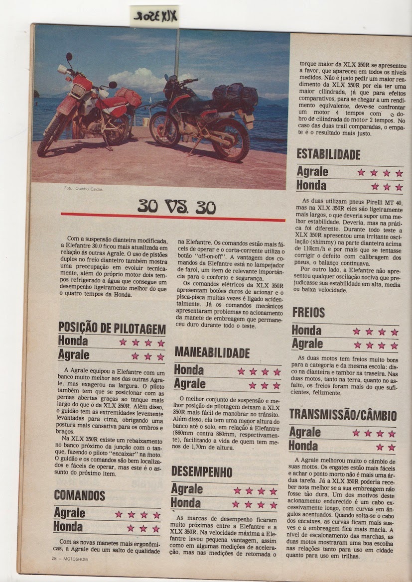 Essa edição de Motoshow nos trás o comparativo das trail de 30 hp! De um lado a Honda XLX350R, com seu monocilíndrico a ar de 4 tempos e 350cc e de outro lado a Agrale Elefantré 30.0, com seu monocilíndrico a água de 2 tempos e 200cc – ambas com 30 cv de potência e disposição pra arrancar sorrisos de seus pilotos!