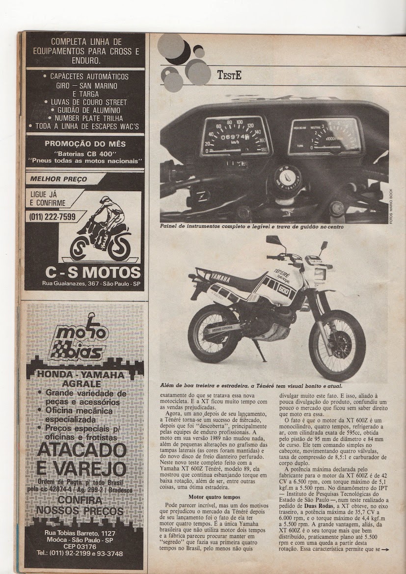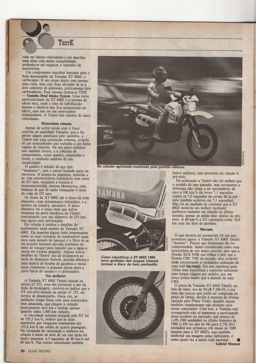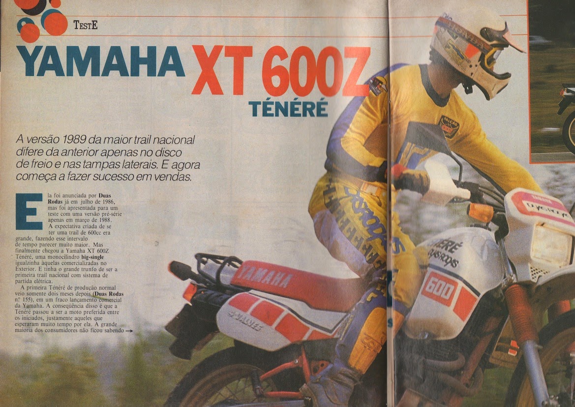 Em 1989 a sonhada e desejada Yamaha XT600Z Ténéré já completava seu primeiro ano de mercado e era apresentada em nova versão, com mínimas diferenças em relação ao modelo 1988: discretas mudanças no grafismo (sem alteração de cores) e o disco dianteiro de freio que passou de sólido a perfurado (ventilado).