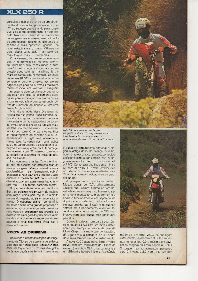 Nessa matéria-teste, o foco é justamente a XLX250R de 1 carburador, comparando seus números com os da XL250R japonesa e da XLX250R de carburador de corpo duplo,  acompanhem nas próximas páginas, sentido-se à vontade para baixar os arquivos e arquiva-los em seu PC.