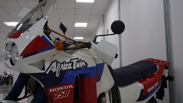 Santo Graal das big trail dos anos 1990, a Africa Twin exposta no Remaza Collection, em minha opinião, é um dos exemplares mais originais, com 44.000 milhas no painel, demonstra ser uma moto efetivamente usada em aventuras, em seu parabrisa, sabiamente, o curador manteve um adesivo de autorização de condução de um dos países que atravessou na América do Sul, se nao estou enganado, marcava data de viagem de 1993.
