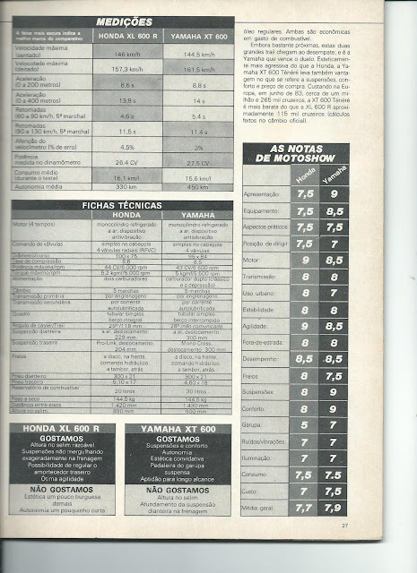 Tive o prazer e a oportunidade de pilotar as duas motos, a Ténéré 600 tive uma naquela época, e a XL600 fui pilotar na Alemanha pouco tempo atras.  As duas motos impressionam pelo porte e desempenho, a XL600 de motor mais suave e a XT600 muito confortável, com a vantagem do maior (e lindíssimo) tanque de combustível.  Convido você, caro leitor, a baixar as imagens e ler novamente esse comparativo que nos fez sonhar 36 anos atrás.